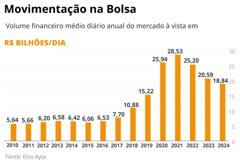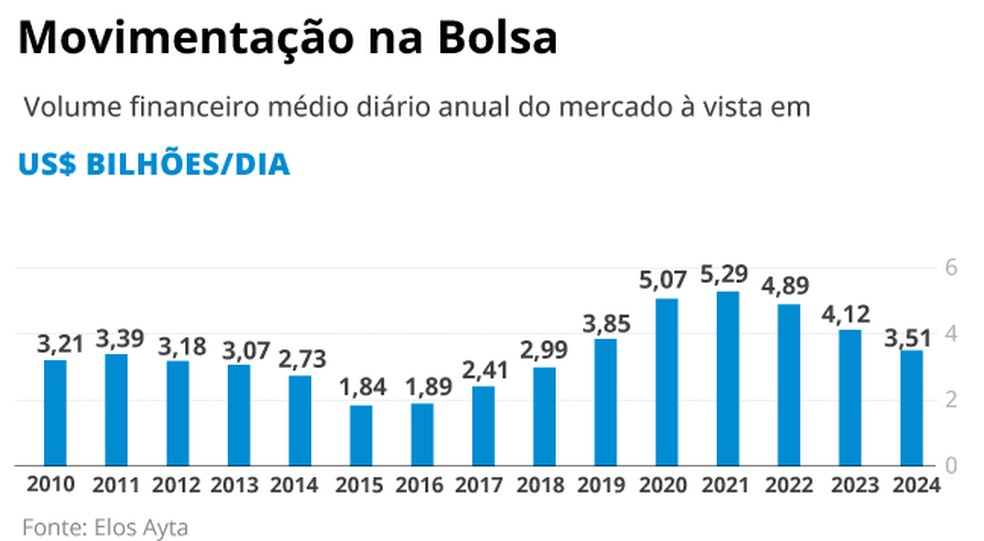 No ano passado,a Bolsa de Valores de São Paulo,a B3,atingiu o menor patamar de liquidez em dólares no mercado à vista em seis anos,segundo levantamento feito pela consultoria Elos Ayta. Em 2024,o volume financeiro médio diário foi de US$ 3,5 bilhões,o valor mais baixo desde 2018. O total em reais ficou em R$ 18,8 bilhões,o menor patamar desde 2019.