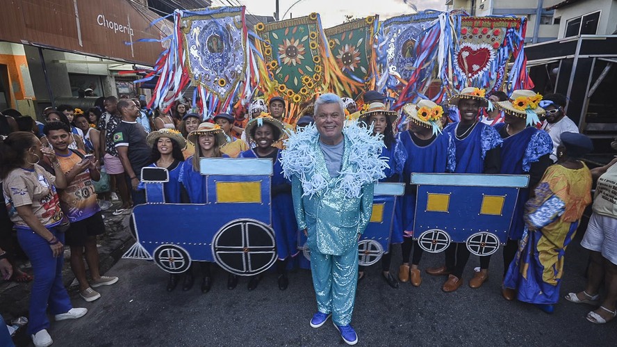 — A cada ano temos a preocupação de apresentar as escolas para os telespectadores de maneira diferente,seja no formato ou nos figurinos. Esse ano,apresentarei da rua,dos ensaios,o teatro dramático das escolas e os sambas completos. Para cada agremiação,fiz uma produção com mecha colorida no cabelo e 12 ternos brilhosos na cor da escola,com ouriços no ombro — conta ele,que na foto aparece gravando uma reportagem sobre a Portela.
