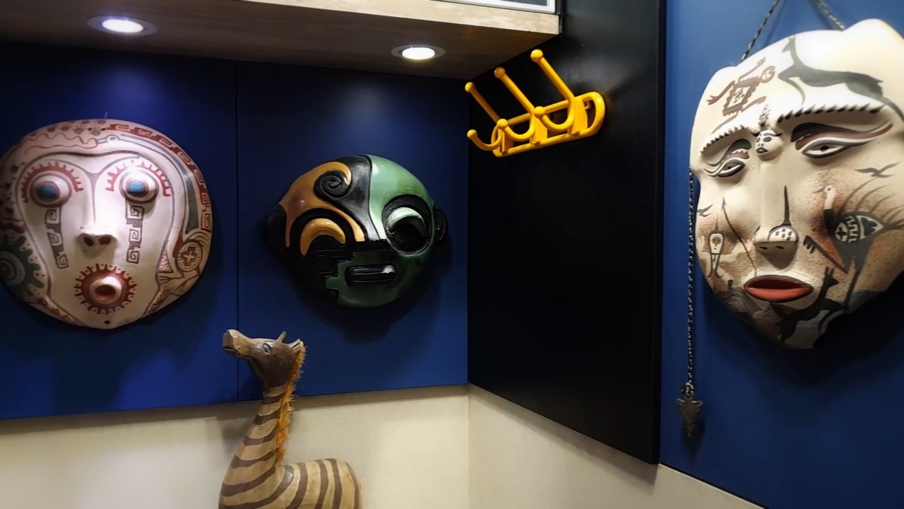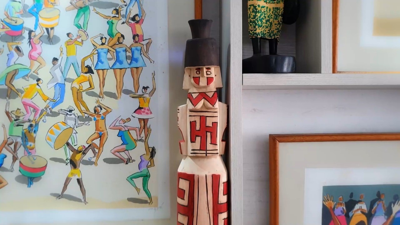 Escultura africana ao lado de um quadro do artista Carybé,na casa de Milton Cunha — Foto: Reprodução
