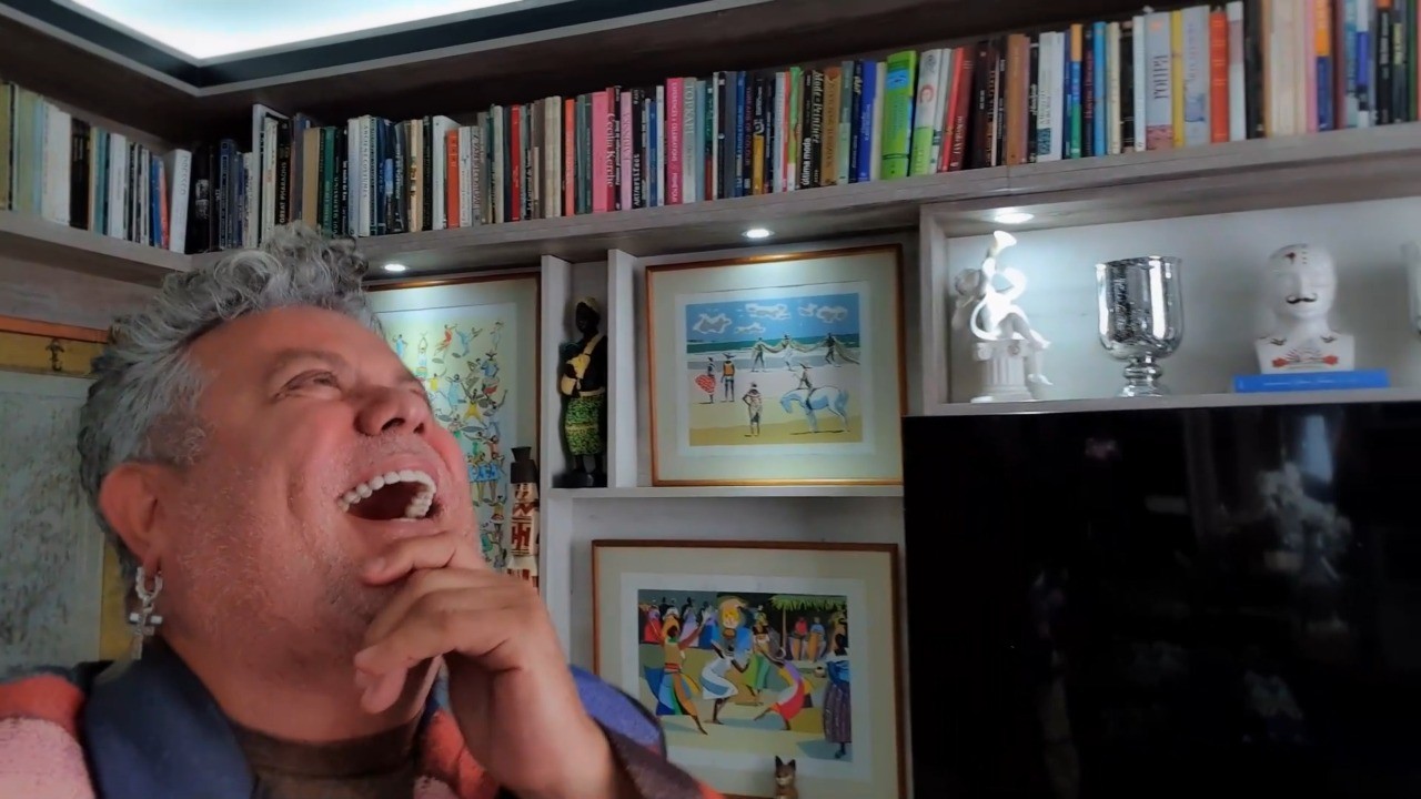 Milton Cunha mostra estante de livros — Foto: Reprodução