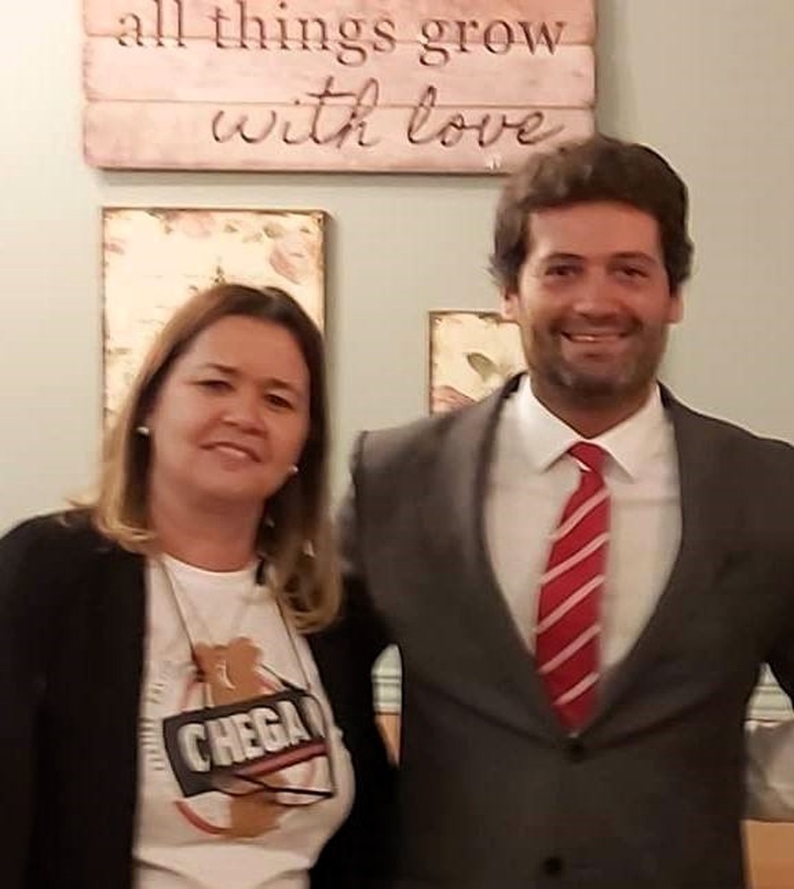 A brasileira Cibelli Almeida e André Ventura,deputado e presidente do Chega,em 2019 — Foto: Arquivo pessoal