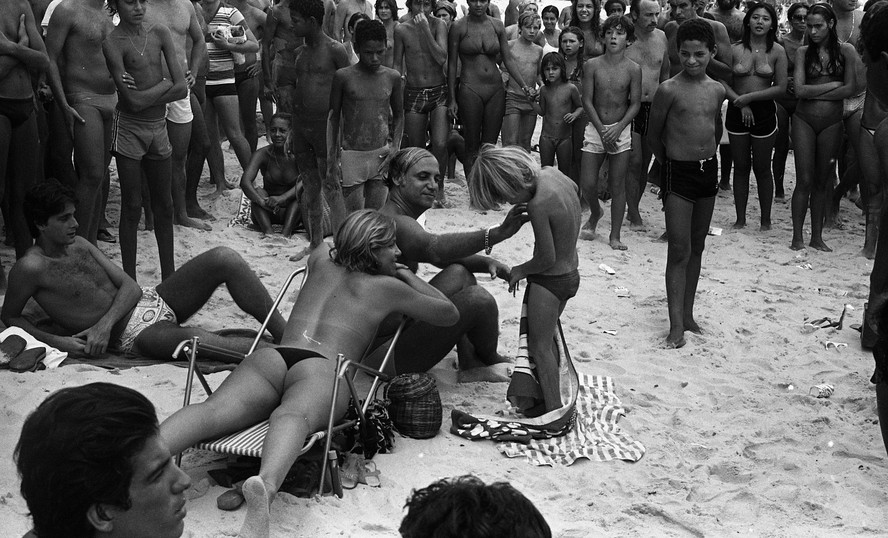 Depois de tantas fotos de crianças brincando,Paulo percebeu uma agitação na areia,com uma pequena multidão se formando ao redor. Ao se aproximar,encontrou uma cena inusitada: uma mulher,com os seios à mostra,tomava sol ao lado do marido enquanto uma multidão assistia. "Estava na moda,as mulheres não queriam se bronzear e ficar com a marca do biquíni. Geralmente só faziam isso quando estavam acompanhadas do marido ou namorado. Eles usavam binóculo para observar o público ao redor",conta.
