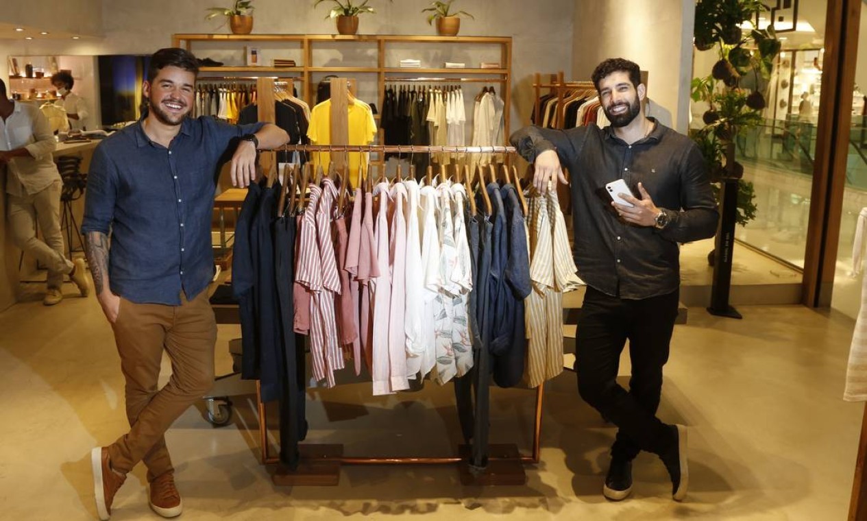 A marca de roupas masculinas Foxton,do Grupo Soma,apostou em uma campanha de incentivo como saída para impulsionar o engajamento das vendas on-line. Pedro Soares (à direita) ganhou um iPhone e Luis Neri,um laptop — Foto: Fabio Rossi / Agência O Globo