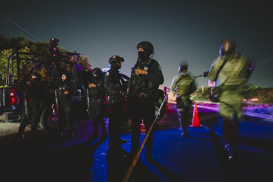 Polícia guarda cena de crime onde os corpos de seis homens foram encontrados amontoados dentro de uma van branca em Culiacán,no México,em 27 de setembro de 2024 — Foto: Meridith Kohut/The New York Times