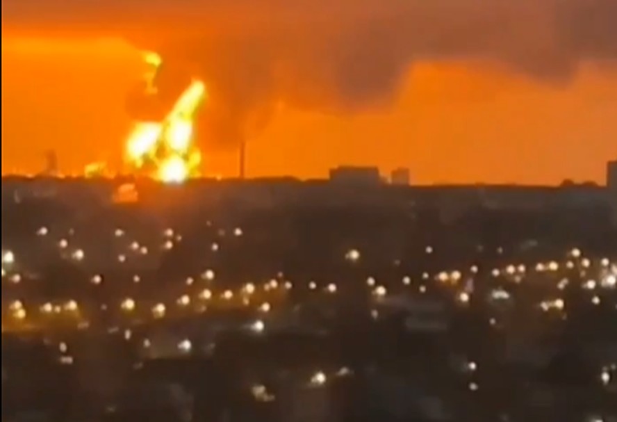 Captura de tela de vídeo mostra depósito de petróleo russo em Saratov pegando fogo após sofrer ataque de drones ucranianos — Foto: Reprodução/Redes Sociais