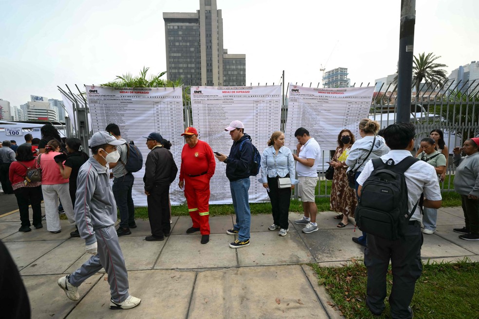 Pessoas aguardam em fila do lado de fora de uma seção eleitoral em Lima,em 12 de abril de 2026 — Foto: Luis Robayo/AFP