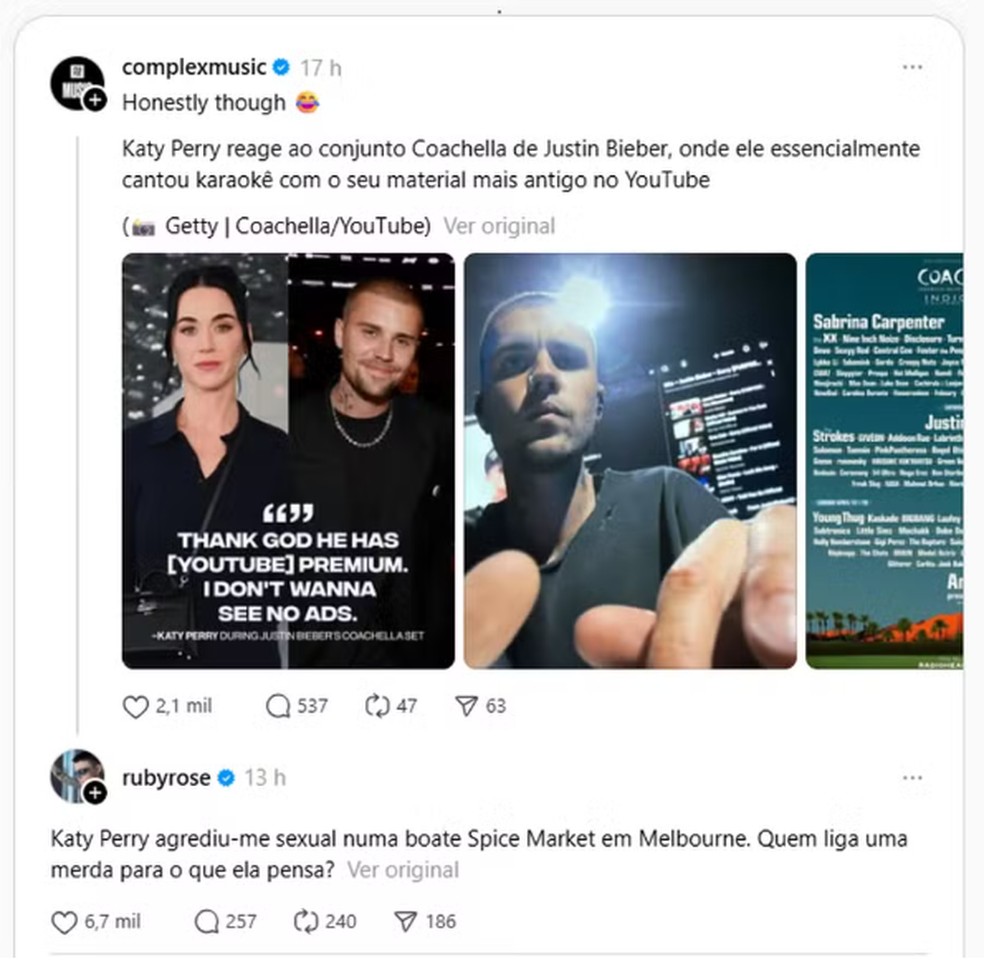 No último domingo,a atriz Ruby Rose usou as redes sociais para acusar a cantora Katy Perry de agressão sexual. O relato surgiu após Ruby comentar uma publicação que mostrava a reação de Katy Perry durante um show de Justin Bieber no Coachella. Em seguida,a atriz detalhou um episódio que,segundo afirma,aconteceu há 20 anos na Spicy Market Nightclub,em Melbourne,na Austrália.