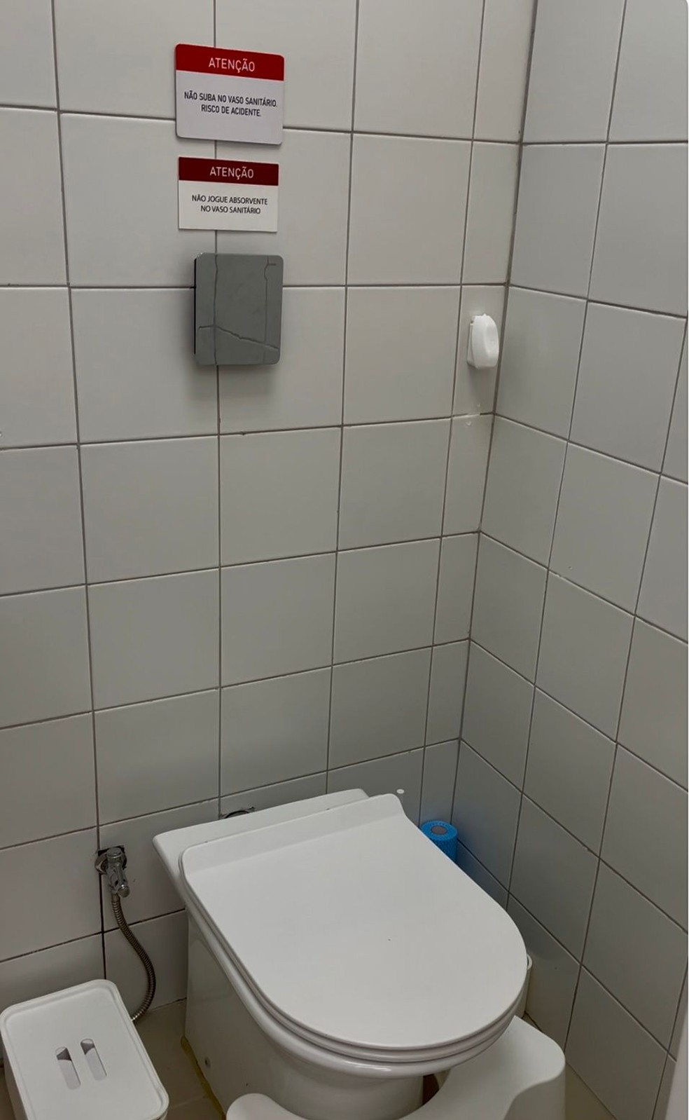 Jornalistas e influenciadores puderam ver,na noite da última sexta-feira,esse detalhe do pequeno cômodo todo branco,que tem uma privada,uma pequena pia,uma lixeira,uma ducha higiênica,um odorizador de ambiente preso na parede e um acessório para apoios dos pés localizado na frente do vaso.