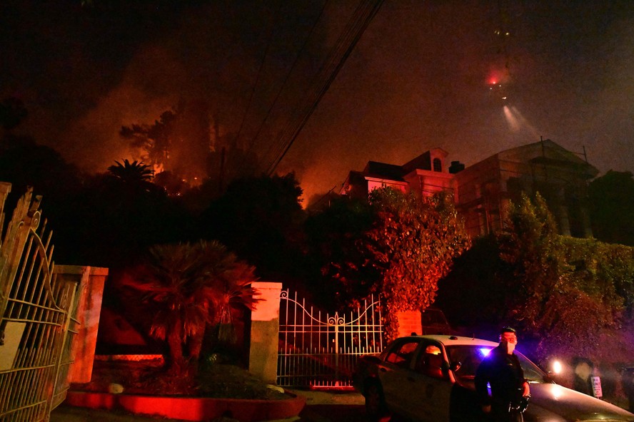Policial em frente a uma casa durante incêndio Sunset,em Hollywood Hills,Los Angeles — Foto: Robyn Beck / AFP