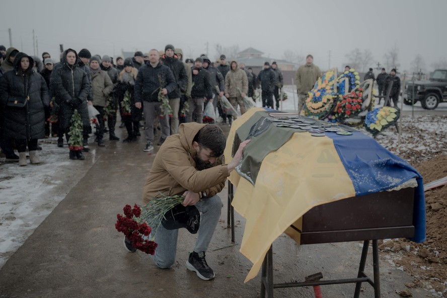 Militar presta homenagem diante do caixão de Anton Spitsyn,soldado morto em combates com a Rússia — Foto: Ivan SAMOILOV / AFP