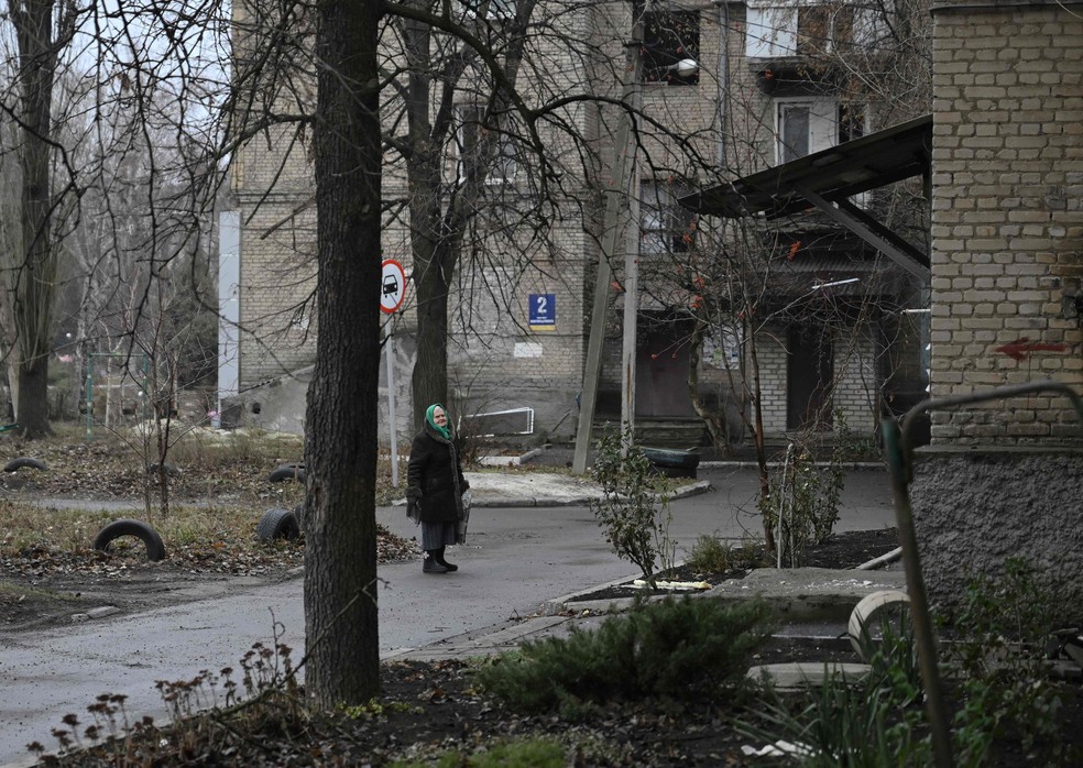 Mulher caminha pelas ruas de Pokrovsk,em Donetsk,na Ucrânia,região muito atingida pela ofensiva russa no país — Foto: Genya Savilov