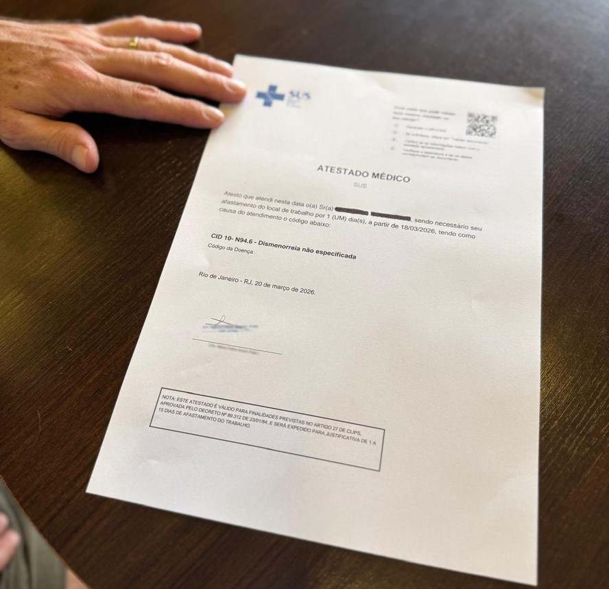 Homem recebe atestado médico dispensando do trabalho por cólica menstrual grave — Foto: Selma Schmidt