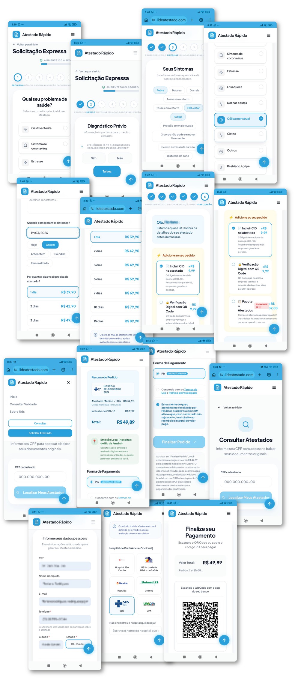 O processo do site usado por ela é automatizado. Não há consulta online. Além de uma lista de doenças,o usuário pode selecionar a unidade de saúde — incluindo opções como UPA e SUS — e escolher o período de afastamento,com preços entre R$ 39,90 (um dia) e R$ 89,90 (15 dias). Depois de preencher um questionário simples e informar dados pessoais,entre eles o CPF,é direcionado ao pagamento por PIX,com a promessa de que,após a transferência,receberá o atestado. Se a pessoa quer incluir o código da CID (Classificação Internacional de Doenças) paga mais R$ 9,99. Para a anexar a verificação digital com QR Code,são mais R$ 9,99.