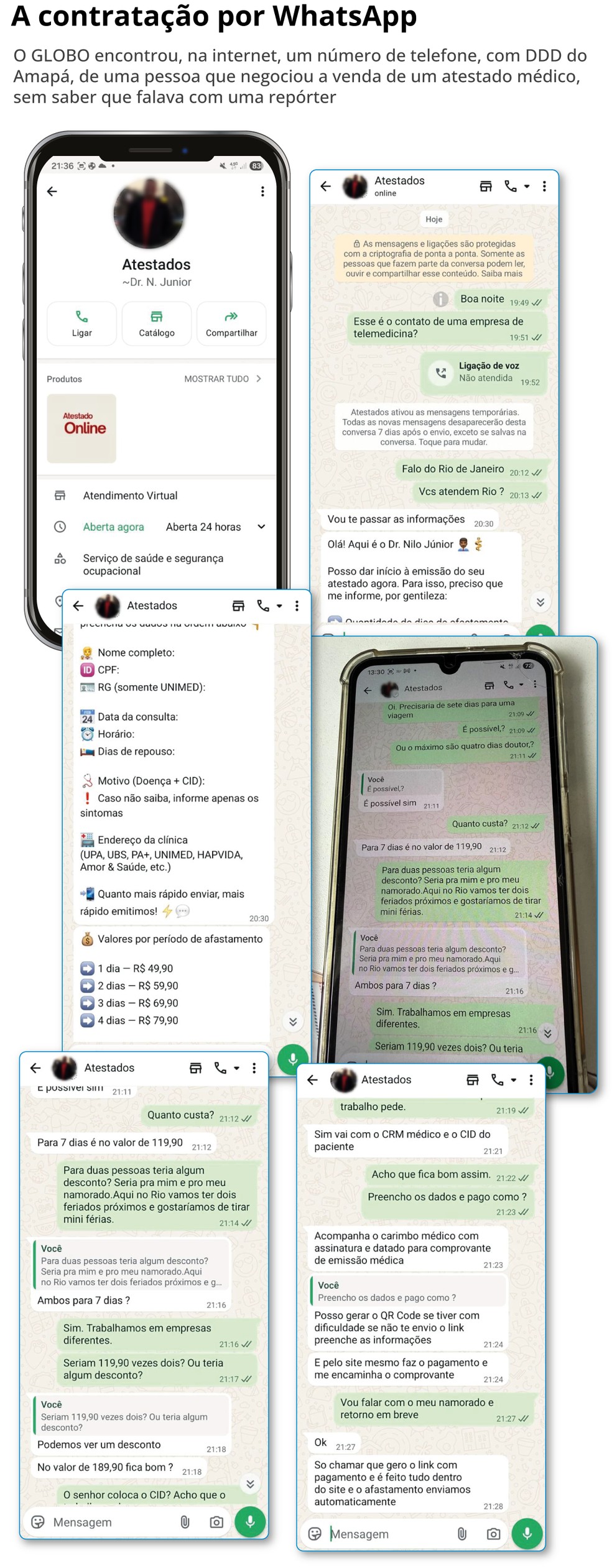 Alguns sites disponibilizam a opção do WhatsApp. Sem saber que falava como uma repórter,alguém,que se identificou como Doutor Nilo Júnior e conversava usando um celular com código do Amapá,apresentou uma tabela com afastamento de um (R$ 49,90) a quatro dias (R$ 79,90). Mas,questionado,disse que faria atestado de sete dias,pois a suposta cliente manifestou a intenção de viajar. Cobrou R$ 119,90. Como seriam documentos para dois,fez abatimento. “No valor de R$ 189,90 fica bom?”,perguntou.